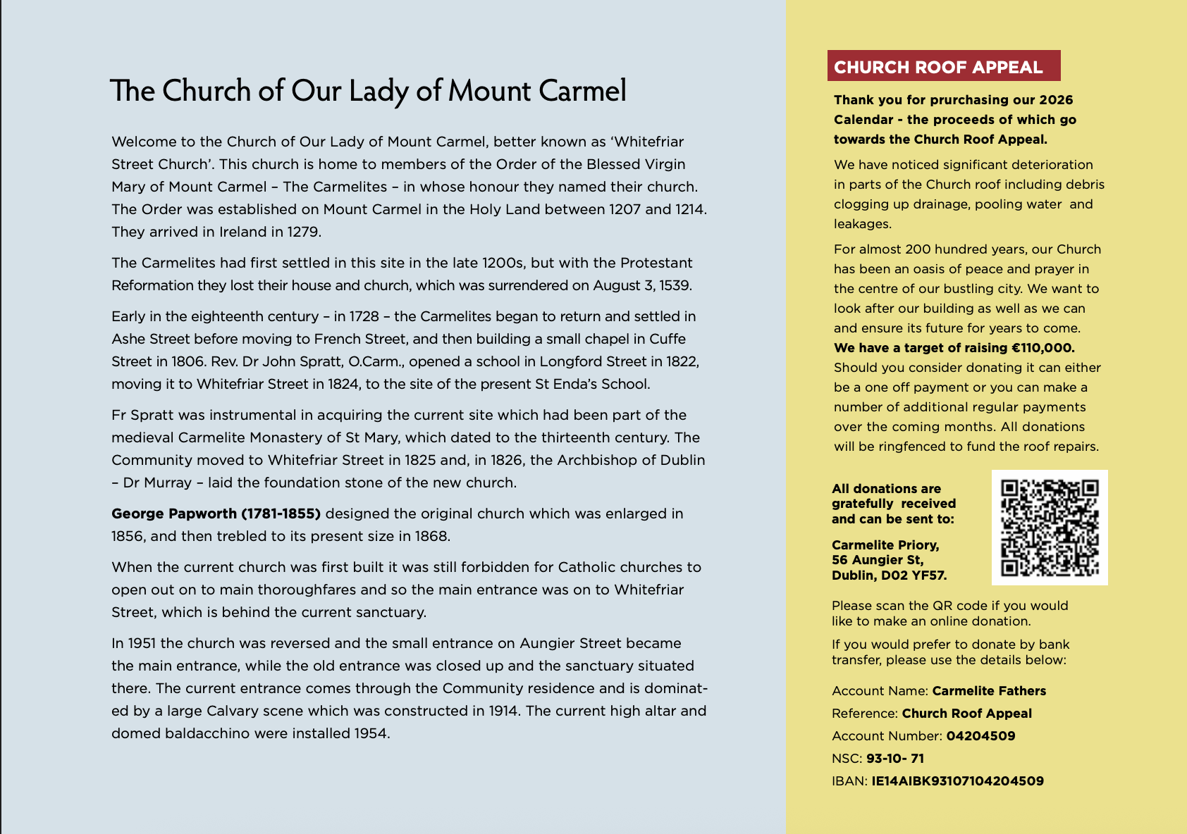 The Whitefriar Street Church Calendar 2026 is produced showcasing a selection of seasonal photographs taken within the church throughout the year. This calendar has been produced with the aim of raising much needed funds to repair the Church Roof which has been damaged over recent winters by the many storms that we have weathered and is now in need of urgent repair.