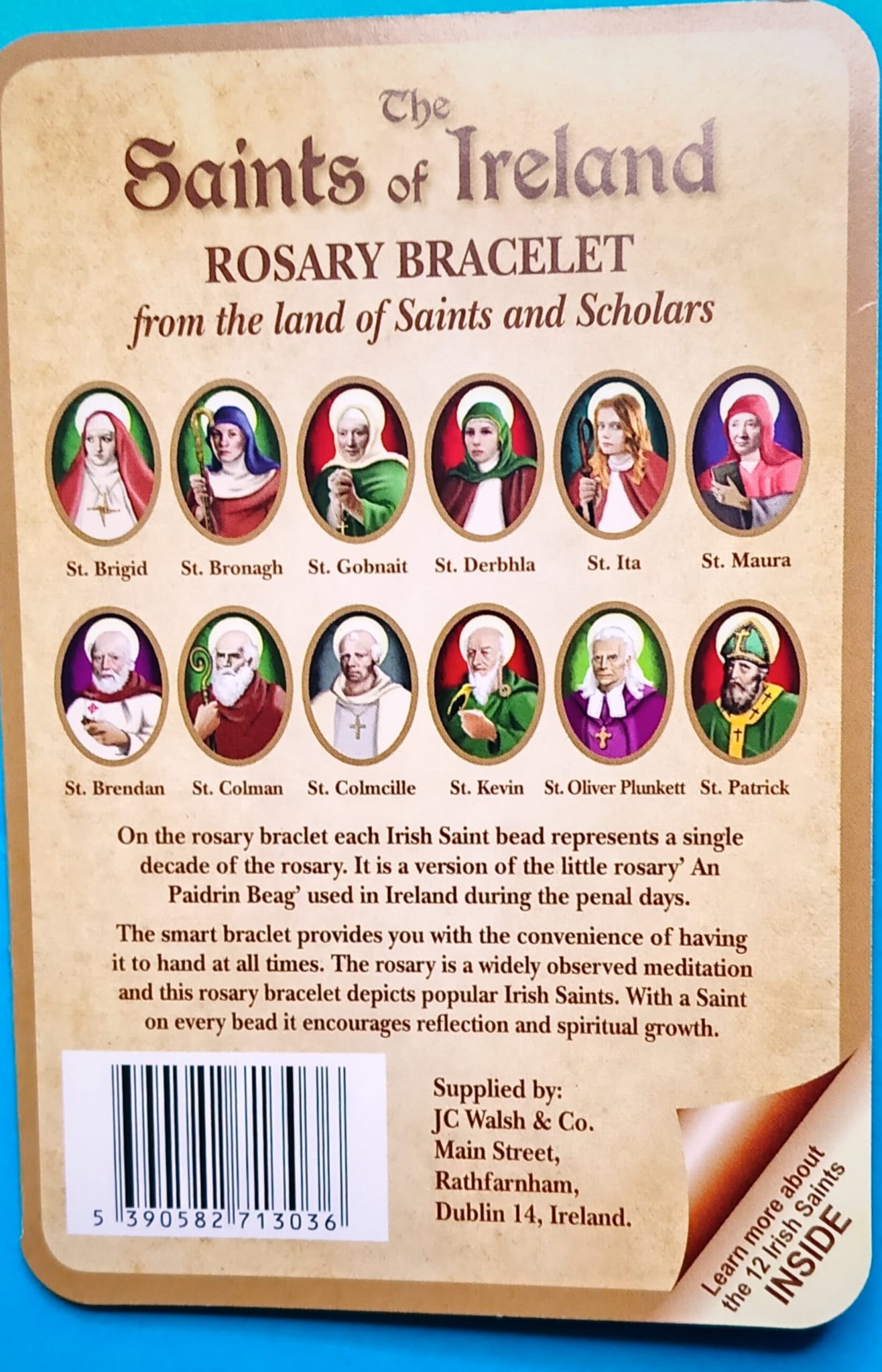 Our Saints of Ireland Rosary bracelet handmade in Dublin, Ireland depicts 12 popular saints from Ireland . Repeated on each prayer bead they remind us of the scholarly masterpiece and encourage spiritual growth.